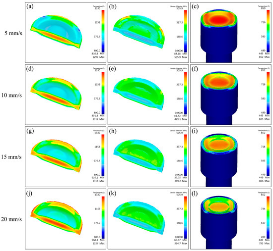 (a,d,g,j) The temperature field distribution, (b,e,h,k) equivalent stress field distribution of the formed part, and (c,f,i,l) the temperature field of the ejector rod with different extrusion speeds.
