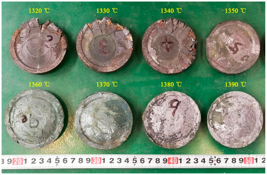 Figure 13 presents the macro morphologies of the formed parts with different billet temperatures. It was found that when the billet temperature was lower than 1350 °C, cracks appeared at the rim of the formed parts, and the formed parts were not completely filled. When the billet temperature was higher than 1360 °C, the external contour of the formed parts was clear, and the formed parts were completely filled. The experimental results were consistent with the simulation results in Figure 7 and Figure 9, which verified the results of numerical simulation and the feasibility of the semi-solid thixoforming well.