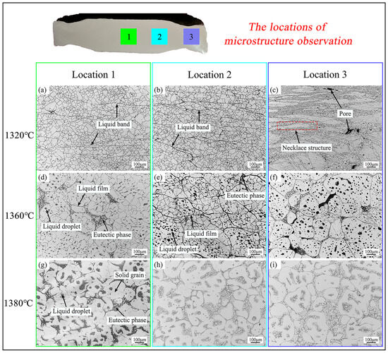 Figure 14 shows the optical microstructures of the formed parts in different locations with different billet temperatures. Location 1 is in the center of the formed part, location 2 is in the transition zone of the half radius of the formed part, and location 3 is at the edge of the formed part. As shown in Figure 14a,b, when the heating temperature was 1320 °C, fine and equiaxed solid grains were clearly observed. Because of the low liquid fraction at 1320 °C, the liquid phases occurred mainly in the form of a liquid band, which was perpendicular to the direction of extrusion. As shown in Figure 14c, the microstructure consisted of elongated grains and many small recrystallized grains, which presented necklace structures. Furthermore, some pores were observed because the thixoformed part was not fully filled at 1320 °C. As shown in Figure 14d–i, when the heating temperature increased to 1360 °C and 1380 °C, the microstructures of the formed parts consisted of solid grains and liquid phases (including liquid droplet, liquid film, and eutectic phase). At 1380 °C, it was found that the proportion of the liquid phase significantly increased. Meanwhile, it was also observed that, at the same temperature, the microstructure at location 3 had more liquid phases.
