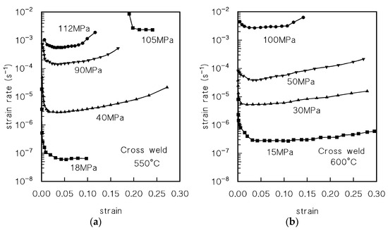 Strain rate vs. true strain creep curves in CW samples: (a) 550 °C; (b) 600 °C. In (a) the remarkable instantaneous plastic strain due to loading at 105 MPa (nominal) during the VLE, i.e., the separation between the two branches of the curve can be easily appreciated.