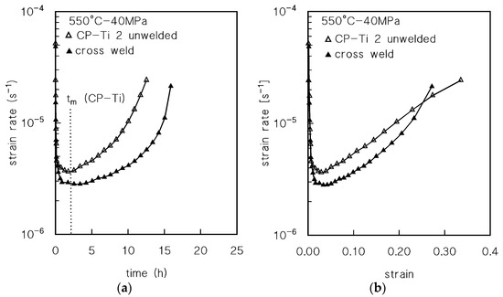 Comparison between the creep curves obtained by testing the parent material sheet (CP-Ti) under the same conditions and the cross-welded sample of the same material: (a) strain rate vs. time plot, (b) strain rate vs. strain plot. In (a) the time for minimum creep rate of CP-Ti sample is indicated by a dotted line.