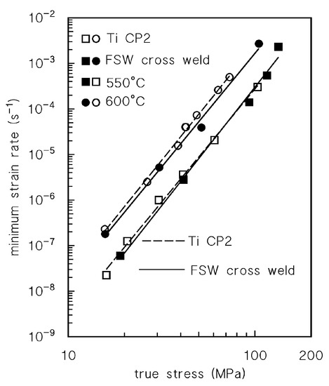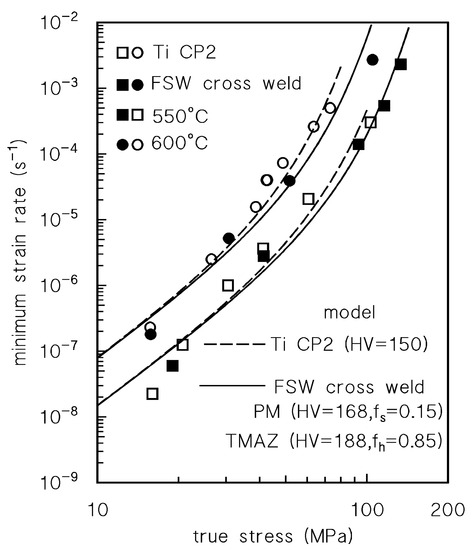 Figure 4 shows that at t = tm for PM, the strain rate of the CW sample is indeed very close to the minimum, in agreement with Equation (7). The major point is the determination of the minimum creep rate dependence on applied stress and temperature for the hard (TMAZ) and soft (PM) zones. These are compositionally similar, but heat and deformation produce a hardened structure in TMAZ. On the other hand, the only input parameter required in Equation (5) is Rmax,, but UTST is available only for the virgin material [32]. These values of the high temperature (500–600 °C) UTS for Ti-CP 2, obtained from the curves presented in [5], were tentatively described by an equation in the form of