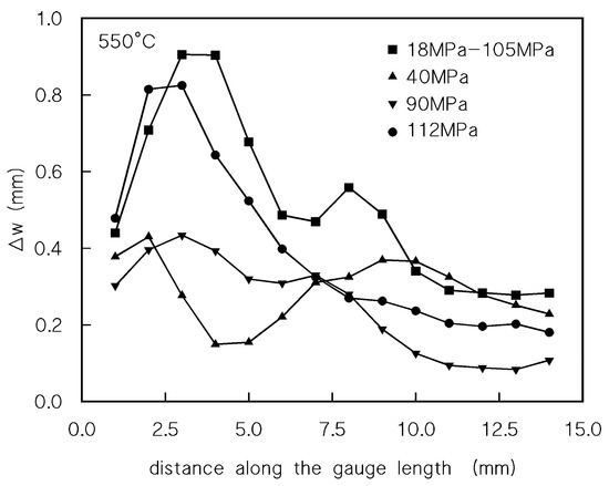 Visual observation of the crept samples reveals that in creep, deformation is not homogeneous (Figure 6 and Figure 7). Figure 6, in particular, shows a macrograph of the sample crept at 550 °C under 18 and 105 MPa (the VLE). The strain localization in the softer portions of the sample is apparent. Figure 7 shows the reduction in width (w) measured along half of the gauge length after creep (just half of the sample is considered since fracture occurred in most of the samples on the other side of the gauge length). The figure clearly suggests that when the sample is loaded under high stresses, strain is highly localized in PM, an effect that is much less pronounced in the low-stress region.
