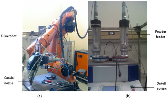 In Figure 1a, a 3 kW continuous-wave ytterbium laser system (YLS) is shown connected to a KUKA robot that controls the mobility of the cladding process. The laser beam is directed toward the optical system’s focusing lenses by the optical fiber through which it is moving. The YLS consists of a robotic control arm (KUKA), a working stage with four numerically controlled axes, a powder feeding system (GTV), and a nozzle head. A laser that is connected to the robotic system controls the processing. The nozzle is placed apart from the steel substrate by a certain amount. The admixed powders are fed coaxially using a commercial powder feeder mechanism (Figure 1b) with a flow balance to control the powder feed rate.