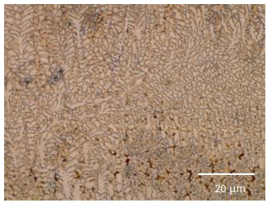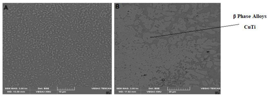 The heat differential caused the dendritic structures in the microstructures to form, as illustrated in Figure 5, Figure 6, Figure 7, Figure 8, Figure 9 and Figure 10. The heat gradient influenced how much residual stress was present. These forces also had an impact on the improved microstructures’ surface quality. Relative stresses may have a deleterious impact on composite coatings if they are too great. If not effectively controlled, these residual stresses could deform the composite coatings. The copper reinforcement employed used a stabilized phase known as the β-phase, which formed during the DMLD solidification phase and is particularly strong [30,31]. The propagation and initiation of the titanium phases are depicted in Figure 7 and Figure 8. These phases were produced during the quick solidification by the chemical reaction of copper reinforcement and titanium alloy base metal in the melt pool. Dendritic grains produced by aluminum–copper structures were created by increasing the scan velocity, powder feed rate, and laser power [28,32]. According to Figure 7, Figure 8, Figure 9 and Figure 10 the two phases produced can be categorized as eutectic phases and inter-dendritic intermetallics. The titanium alloy base metal’s α (alpha) and β (beta) components helped to create the aforementioned phases. The titanium alloy base top surface and the laser nozzle tip had an impact on the phases that formed in the composite coatings. The creation of these phases depended on the molten pool’s size and depth. The depth and extent of the molten pool were also influenced by the scanning speed and laser power. In additive manufacturing, the size of the melt pool and the creation of improved microstructures both have an impact on the mechanical properties.
