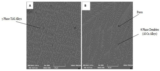 SEM image of composite coatings Ti-6Al-4V/Al-4Cu-7Ti (A) 1000 W, 0.8 m/min and (B) 1000 W, 1.0 m/min.