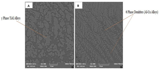 This rate of cooling determines how quickly the beta phase in the titanium alloy base transitions to the alpha phase. The formation of a needle-like alpha phase (Figure 7b and Figure 8b) occurred when the melt pool size was tiny. The combination of copper and aluminum has demonstrated good qualities. Together, they provide a powerful metallurgical link. In the microstructure, the development of composite coatings from the combination of copper and aluminum always results in two different phases: bright and dark occurs when the melt pool size is tiny. Because copper and aluminum are formed from the solid solutions of the composite elements, their differences create a strong metallurgical bond. Columnar, equiaxed, and dendritic microstructures are the dark phases. While the light phase represents the primary titanium alloy, the dark phases can be seen in a variety of shapes and sizes. Copper as a reinforcement has been found to have beta-stabilizing properties by numerous research studies [33,34]. Because the titanium base alloy contains both alpha and beta phases, the fusion of copper reinforcement and the titanium alloy base metal resulted in the propagation of beta-titanium (β-Ti). As can be observed in Figure 9 and Figure 10, titanium–aluminide (TiAl) was mostly formed due to the reinforcing of aluminum. The production of dark gray granules (alpha grain particles) indicates the presence of aluminum [35]. The beta-phase grains’ brownish coloration, which shows the presence of copper, is apparent [36,37]. Dendritic structures began to propagate as the laser power and scan velocity were increased, demonstrating the presence of aluminum–copper (Al-Cu) in the microstructure [34,35].