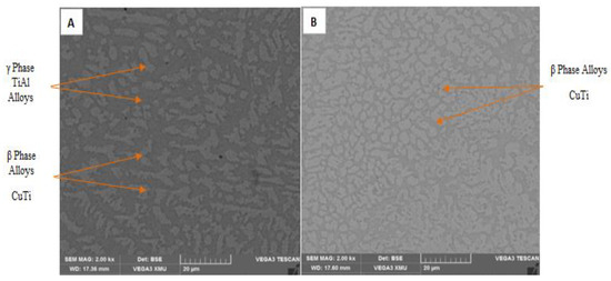 The Ti6Al4V beta-phase change and the development of CuTi’s intermetallic phases are both influenced by the laser’s power intensity. The length of copper diffusion lengthens as laser power rises, increasing the thickness of CuTi’s intermetallic phases. When the laser power intensity is decreased, the characteristics of CuTi can be improved [38,39,40]. Additionally, titanium–aluminide has been said to provide distinct strength at high temperatures, low density, and excellent oxidation resistance. Even at room temperature, the material is fragile due to its low fracture toughness, which has been documented in the literature. These outstanding qualities ultimately affect the characteristics of the composite coatings that are manufactured. Despite titanium aluminide’s excellent properties, interlamellar spacing, lamella colony size, and alloying reinforcement addition made these properties possible. Reduced interlamellar spacing affects interlamellar strength at high temperatures [41,42].