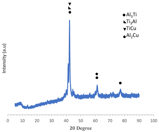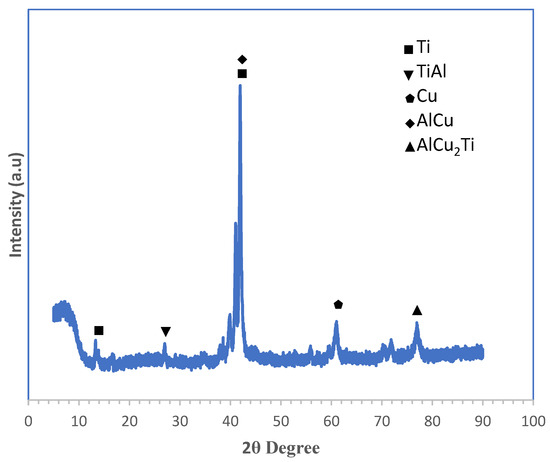 Due to the various weight percentages of the copper and titanium reinforcements, variations in the composition of the diffraction peaks were noted. Due to titanium’s highest weight percentage in the base metal (Ti6Al4V) and aluminum’s highest weight percentage in the reinforcing powders, a peak of Ti, TiAl, and Al could be detected in Figure 11. Cu-Ti’s intermetallic phases are created during solidification by a quick reaction between liquid and solid in the melt pool. These phases can assess the mechanical characteristics and microhardness of composite coatings. It has been documented in the literature that CuTi2 is brittle and prone to cracking, but CuTi and TiCu are also known to be ductile. The phases that are created can have an impact on the composite coatings’ mechanical characteristics.