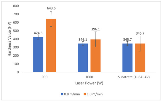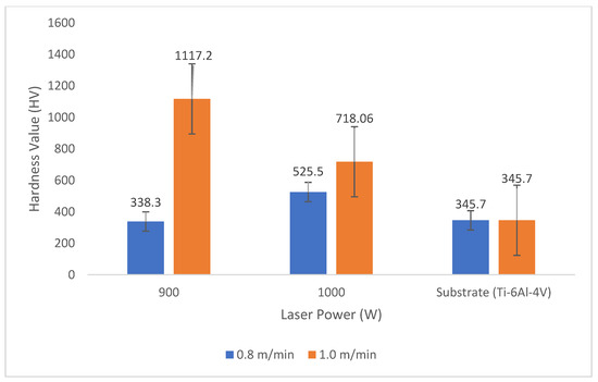 The microhardness value of 643.6 HV1.0, as shown in Table 5, with an increased scanning speed of 1.0 m/min, is responsible for the decreased laser power of 900 W. For composite coatings of Ti6Al4V and A4Cu7Ti, the next value of 424.5 HV1.0 at a scanning speed of 0.8 m/min still happened at 900 W of laser power. As shown in Figure 13 and Figure 14, the same is true for Ti6Al4V/Al7Cu5Ti, which has a maximal hardness value of 1117.2 HV1.0 at 900 W of laser power and 1.0 m/min scanning speed.