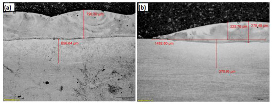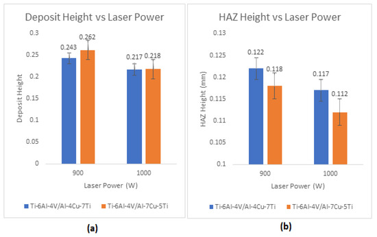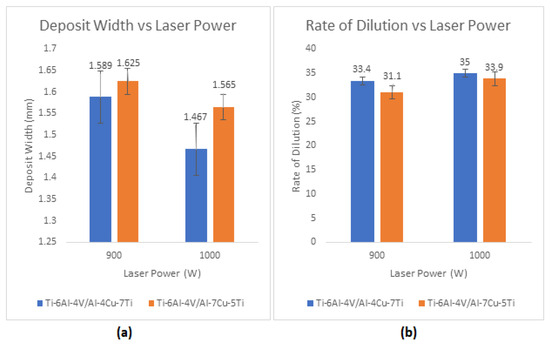 Figure 15a,b show that the height of the heat-affected zone (HAZ), the height of the deposit (coatings) on the base alloy, and the changes in the laser power used for the LMD operation are all geometric parameters that are closely related to each other. As demonstrated in Figure 16a, this interaction also has an impact on deposit width. Composites with 900 W laser energy input had narrower deposits, but composites with a 1000 W laser power increase had wider deposits. The clad’s height and width [46] demonstrate that the 900 W laser power was adequate to produce composites with dense geometric features. The clad becomes thinner and slenderer as a result of the increased energy of the LMD operation [46]. The relationship between the rate of dilution and laser power is seen in Figure 16b. The composites’ rate of dilution shows that when the laser power of the LMD operation is increased, so is the rate at which the coating materials diffuse into the base alloy’s structural matrix and mix the metallurgical properties of the components. The composite with the highest rate of dilution is Ti6Al4V/Al7Cu5Ti. This indicates that the fast diffusion of the coating components into the base alloy (substrate) is made possible by raising the copper content of the base alloy’s structural matrix [47].