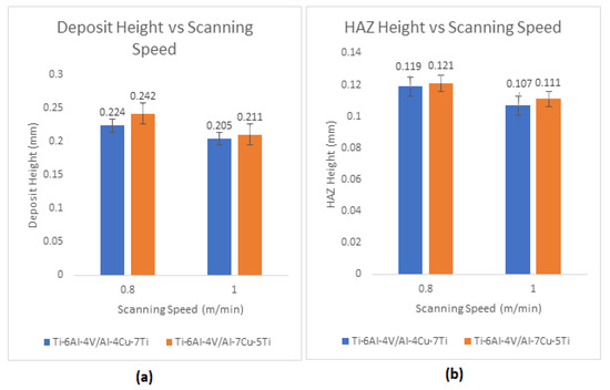 Graph of composite coatings geometrical heights and HAZ (a) deposit height against scanning speed and (b) HAZ height against scanning speed.