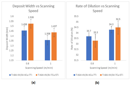 The analysis of the height features in relation to the variations in scanning speed for the deposit height and HAZ height is shown in Figure 17. The geometrical height features of the deposited clad diminish with the increasing scanning speed of the LMD operation, as indicated by the graphed results shown in Figure 17a,b. This occurs as a result of the wide range of powder materials that are ready to react with the laser and form dense deposits in the clad. More coating material was deposited per unit length of base alloy when the scanning speed was slower. This suggests that the coating materials had more time to interact with the laser and fuse with it. Because there was not enough time for the coating materials to interact with the laser and fuse with the base alloy, less dense composites were generated as a result of the higher scanning speed of the LMD operation. Further support for these results comes from the graph showing the deposit width as a function of scanning speed. The rate of dilution of the coating materials inside the base alloy’s structural matrix increases as the scanning speed of the LMD operation increases, as seen by the graph depicting the rate of dilution as a function of scanning speed (Figure 18) [48]. This shows that more coating components work in concert with the underlying alloy to produce composites with a higher scanning speed. The LMD operation’s deposit width reduced (Figure 19) when the scanning speed increased and increased when the scanning speed decreased, owing to the additional time given to the coating materials to interact with the laser and fuse with the base alloy [40,41]. This implies that the base alloy and coating components mix effectively beneath the surface of the deposited clad [49,50].