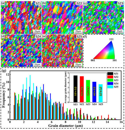- The grain size of the SZ progressively decreased from the top to the bottom. The strong and centralized stirring action and the heat dissipation due to the backing plate contributed to the relatively fine recrystallized grains at the bottom of the SZ (SZ5).