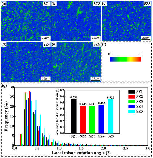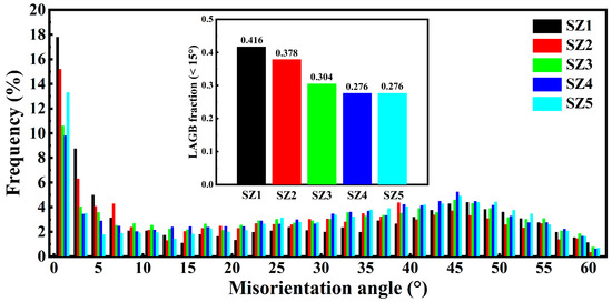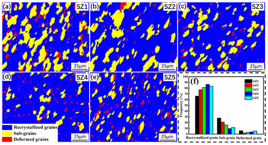 - There was an upward trend in the degree of dynamic recrystallization from the top to the bottom of the SZ. However, the highest fraction was found in the SZ4 region, instead of the bottom of SZ (SZ5). Compared with SZ4, the lower welding heat input and the larger plastic deformation in SZ5 were responsible for the lower recrystallized grain fraction in this region.