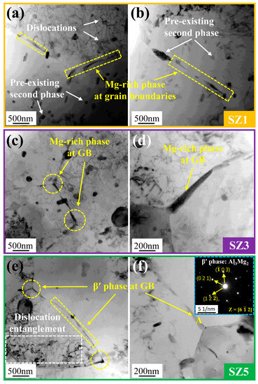 - A 100-nm-thick β′-Al3Mg2 phase was found to precipitate along the grain boundaries in all the SZ samples. The middle and bottom of the SZ exhibited more continuous precipitates along the GBs due to the finer grain size and the larger fraction of HAGBs in these regions.
