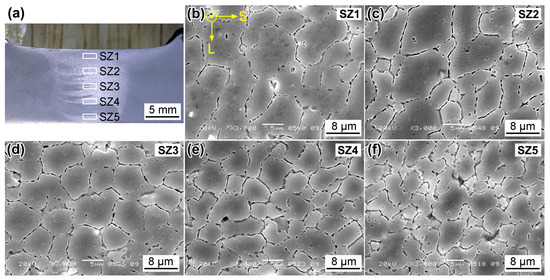 - Higher levels of deformed grains were observed in the top (SZ1) and bottom of SZ (SZ5), and this can be attributed to the greater levels of plastic deformation induced by the shoulder pressing and the strong stirring action of the pin in these two regions, respectively.