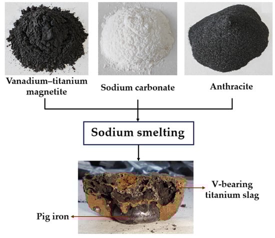 Vanadium–titanium magnetite (VTM) is a strategic resource which is rich in vanadium, titanium, and iron [,]. Blast furnaces, which have the advantages of a large treatment capacity and high production efficiency, have been widely used for industrial VTM smelting. However, all titanium resources that originally occur in VTM migrate into the blast furnace slag, rendering the effective utilization of titanium challenging [,,]. More than 3 million tons of titanium slag is produced every year, and over 80 million tons of titanium-bearing blast furnace slag has been accumulated in China []. Recently, some non-blast furnace direct reduction techniques, such as the pre-reduction–electric furnace melting separation process and the direct reduction–magnetic separation process, have also been proposed [,,]. Although they could replace the blast furnace process to some extent, they still could not simultaneously recover the iron, vanadium, and titanium in VTM, and especially the titanium resource is not effectively utilized [,]. To efficiently recover these resources from VTM, a novel sodium smelting process, which combined pyrometallurgy and hydrometallurgy, was proposed, and a pilot test consuming 50,000 tons of VTM annually was established [,,]. In the pyrometallurgy stage, a proportional mixture of VTM, sodium carbonate, and anthracite is smelted to obtain pig iron and vanadium-bearing titanium slag. In the hydrometallurgy stage, the vanadium-bearing titanium slag is leached with water to produce vanadium and titanium products. This technology allows for the melting and separation of molten iron and vanadium-bearing titanium slag at relatively low temperatures. The obtained content of impurity elements in the molten iron is very low, but the titanium content fluctuates considerably. Therefore, it is imperative to study the migration law of titanium during the sodium smelting process.