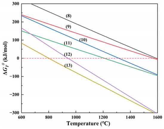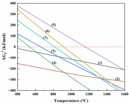 The of the above equations at different temperatures was obtained through calculations, as shown in Figure 3. It can be seen that the spontaneous reaction temperatures of Equations (1)–(4) were very low, indicating that CaO·TiO2, Na2O·TiO2, NaAlSiO4, and Fe are preferentially generated in the carbothermal reduction process. In addition, with the spontaneous reaction temperature of reaction (7) being around 818 °C, the possibility of TiC and TiN generation is very high. Chen et al. [] tested the viscosity of slag and showed that the slag was completely melted at 1150 °C with the appropriate components, indicating that the above reactions are possible in the sodium smelting temperature range.