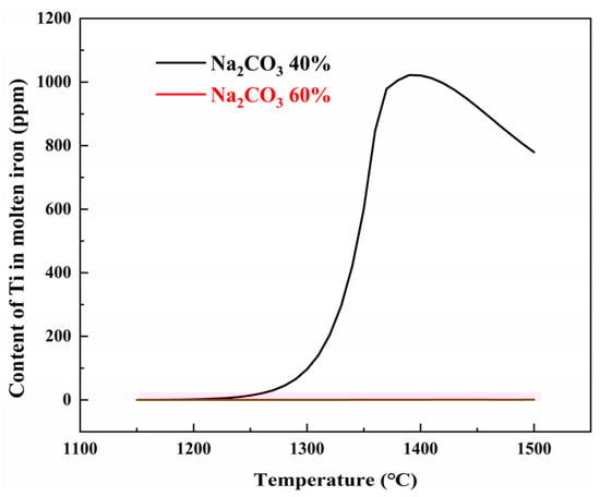 Figure 6 shows the effect of temperature on the content of Ti in molten iron. One can see from the calculated data in Figure 5 that when the amount of sodium carbonate is 40%, the Ti content in molten iron is at a lower level (<13.8 ppm) when the temperature is below 1250 °C. However, when the temperature exceeds 1250 °C, the Ti content in molten iron increases rapidly with the increase in temperature. When the temperature rises to 1450 °C, the Ti content in molten iron reaches about 1000 ppm. And then, with the increase in temperature, the Ti content in molten iron is slightly decreased. When the amount of sodium carbonate is 60%, the titanium content in molten iron remains below 1 ppm. Therefore, it can be concluded that a relatively low temperature (<1250 °C) is conducive to the production of molten iron with less titanium impurities.