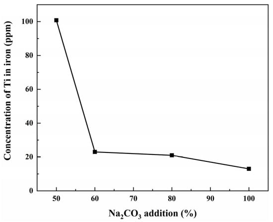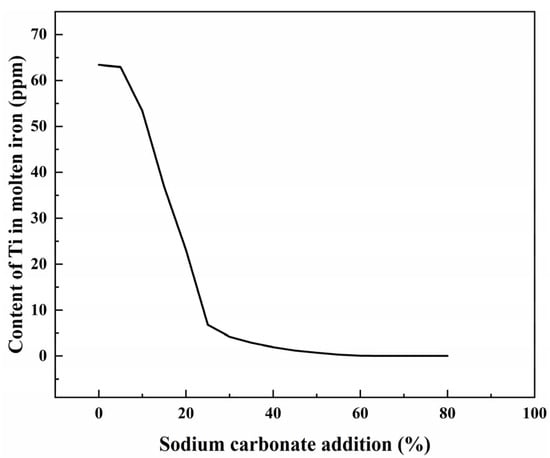 The addition of sodium carbonate significantly lowers the melting point of slag, which drastically reduces the temperatures required for smelting VTM, and also enables the slag to have good fluidity at low temperatures as well as excellent impurity removal. A mixture of 100 g of VTM, 30% of anthracite, and varying amounts of sodium carbonate were combined and heated at 1200 °C for 2 h to investigate the effect of the addition of sodium carbonate on the Ti content in molten iron.