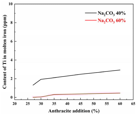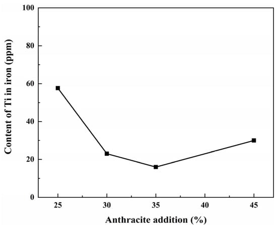 The active ingredient in anthracite is fixed carbon, which makes up part of its volatile matter, while ash has no reduction effect, but can act as a slag-forming agent. A combination 100 g of VTM, 60% of sodium carbonate, and different amounts of anthracite was taken and heated at 1200 °C for 2 h to investigate the effect of the addition of anthracite on the Ti content in molten iron.