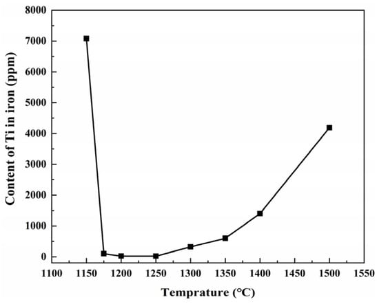 As shown in Figure 9, the Ti content in V-bearing pig iron can reach over 7000 ppm at 1150 °C. At this time, the temperature is low, the slag viscosity is high, and the separation of the slag and iron is insufficient, resulting in a large amount of slag entrained in the molten iron. Therefore, the Ti content in the molten iron is abnormally high. When the temperature increases to 1200 °C, the separation between the slag and the iron is good. At this time, the quality of the molten iron is good, and the Ti content is 23 ppm. With the gradual increase in temperature, the Ti content in the molten iron also gradually increases, which is consistent with the thermodynamic calculation results. At 1300 °C, the Ti content in molten iron reaches 322 ppm. When the temperature exceeds 1400 °C, the Ti content in the iron sample abnormally increases.