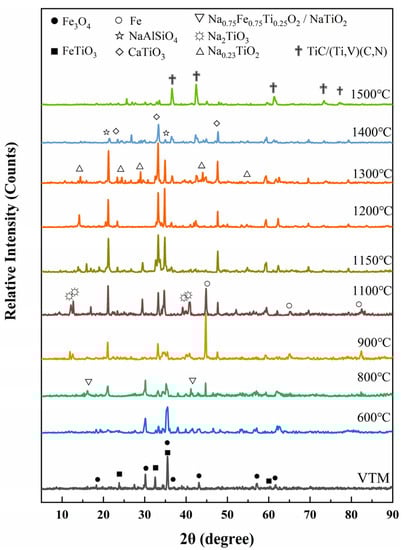 Figure 10 shows the XRD patterns of the slag in the sodium smelting of VTM at different temperatures. It can be seen that the characteristic peaks of NaAlSiO4 and CaTiO3 begin to appear at 600 °C. Fe begins to be reduced at about 800 °C. When the temperature rises to 900–1100 °C, the characteristic peaks of elemental Fe rapidly strengthen, indicating that the Fe phase is formed in large quantities, while NaTiO2 is further transformed to Na2TiO3. At 1150 °C, the iron begins to separate from the slag, as this temperature is close to the range of the melting point of pig iron and, at the same time, a weak characteristic peak of TiCN appears. When the temperature rises to 1200 °C, there is almost no elemental Fe phase in the XRD, indicating that the slag and iron are fully separated. At this time, the Na2TiO3 in the slag begins to transform into Na0.23TiO2 or Na4Ti5O12. At 1300 °C, it can be seen that the characteristic peak of NaAlSiO4 begins to weaken, and the peak of sodium titanate is further altered, possibly due to the transition from Na4Ti5O12 to Na0.23TiO2. When the temperature reaches 1400 °C, the characteristic peaks of TiCN in the slag are obviously strengthened, while the peaks of CaTiO3 begin to weaken. At 1500 °C, only a strong TiCN phase remains in the recognizable phase, indicating that CaTiO3 is reduced to TiCN. It is speculated that the abnormal increase in Ti content in V-bearing pig iron is closely related to the generation of the carbonitrides of Ti. Therefore, in order to control the Ti impurity content in pig iron, the smelting temperature should be controlled between 1150 and 1250 °C.