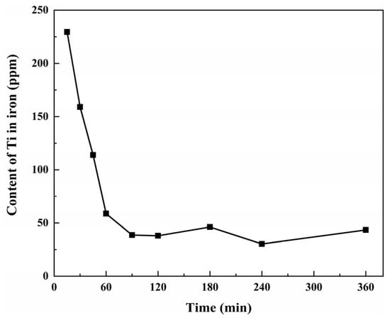 As shown in Figure 11, the reduction process of VTM is very rapid, and after about 15 min, V-bearing pig iron blocks were formed, and the Ti content in the iron sample was 229 ppm, indicating that the Ti impurities had not been completely separated. And the Ti content in the molten iron reached 23 ppm at 120 min. As the heating time was prolonged, the Ti content fluctuated within a relatively low range and could not be further reduced.