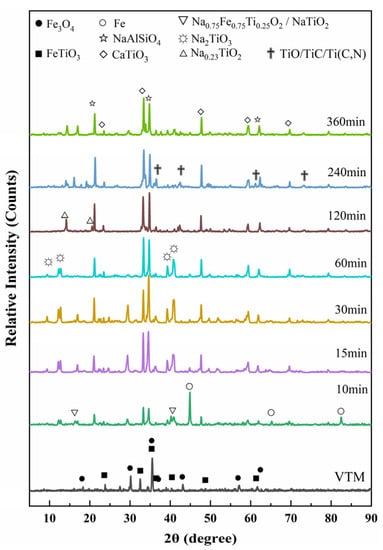 Figure 12 shows the XRD patterns of slag in the sodium smelting of VTM at different heating times. It can be seen that the sodium reduction reaction process is very fast and was completed within 10 min. At this time, there were very strong elemental Fe characteristic peaks in the slag phase, and the slag was mainly composed of Na2TiO3, NaAlSiO4, and CaTiO3. However, the slag and iron were not separated, which may have been due to the low C content in the newly reduced V-bearing pig iron, which had a melting point higher than 1200 °C and could not form droplet aggregation and growth. After 15 min, the characteristic peaks of elemental Fe in the slag phase were already very weak, indicating that most of the iron droplets in the slag had been separated from the slag. After 120 min, the slag and iron were completely separated, and V-bearing pig iron with a low Ti content was obtained.