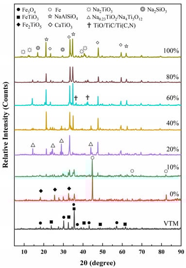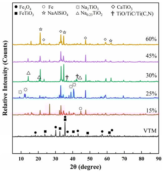Figure 14 shows the XRD patterns of slag in the sodium smelting of VTM with different amounts of sodium carbonate added. It can be seen that VTM can undergo a solid state reduction reaction when Na2CO3 is added at a level of less than 10%. Although there is a strong characteristic peak of Fe in the slag phase, the slag and iron cannot be separated. When the addition of Na2CO3 is at a level of 20–40%, Na2TiO3, NaAlSiO4, and CaTiO3 are formed in the slag phase, but the characteristic peaks of the elemental Fe are not strong. This indicates that, to obtain a complete iron block, it is necessary to ensure that there is a certain excess of Na2CO3 added on the premise of it fully combining with the gangue elements such as Ti, Si, and Al. When the amount of Na2CO3 added is at a level of 50–100%, high-quality V-bearing pig iron can be obtained. However, in the actual smelting process, excessive sodium carbonate will cause adverse effects such as increased smelting costs, severe equipment corrosion, and a poor operating environment. Therefore, it is necessary to control the amount of Na2CO3 used.
