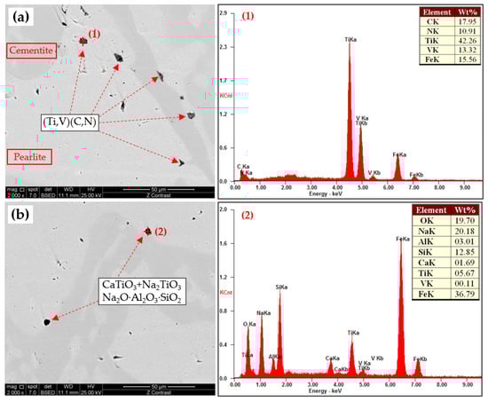 As can be seen in Figure 18a, the gray phase is the cementite body and the bright phase is the pearlitic body. It can be seen that the fine inclusion particles are distributed in the two phases. It was confirmed that there are two forms of Ti present in iron blocks. The first form is the CaTiO3 or Na2TiO3 slag phase that fails to float into the slag phase, and this formation of titanium inclusions is the main reason for the significant fluctuation of the Ti content in pig iron. By extending the smelting time or enhancing the mass transfer, this slag inclusion can be promoted to float to the surface, ultimately reducing the Ti content in pig iron. The second form is a refractory (Ti,V)(C,N) solid solution phase formed by the transformation of CaTiO3 or Na2TiO3. This form of titanium inclusion is mainly formed during the solidification process of molten iron, which is inevitable and a key factor in further controlling the titanium content of V-bearing pig iron at an extremely low level. In addition, Ti may also exist in the Fe-Ti alloy phase, and this form of titanium inclusion needs to be reduced through further treatment.