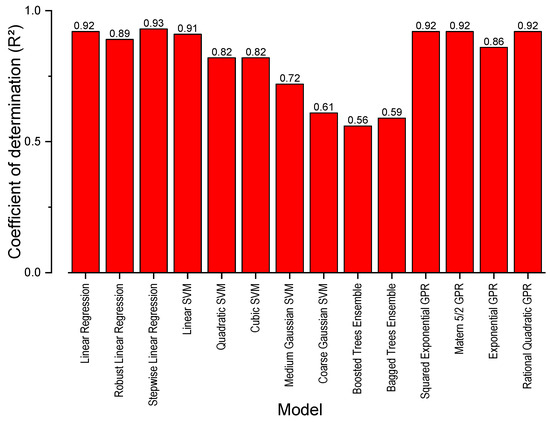 Figure 1 presents the R2 values for the prediction models developed using linear regression, decision trees, SVM, and GPR. For the decision tree models, the R2 values for the fine, medium, and coarse tree models were less than 0.50; therefore, they were not plotted.