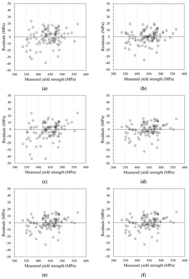 Table 6 lists the excellent prediction performance of both the linear regression and GPR models. The stepwise linear regression model demonstrated a marginally higher MAPE than the GPR model. However, the stepwise linear regression model also exhibited a higher R2 value, surpassing the GPR model by 0.01. To assess the residual tendency of the model, residual analysis was conducted for both linear regression and GPR. Figure 2 illustrates the residuals from the prediction models, depicting a random distribution without any discernible trends in the measured yield strength. Because linear regression models require fewer computing resources, they are generally preferred over GPR models. Despite the slightly higher MAPE in the stepwise linear regression, the model’s higher R2 value and practical advantages make it a favorable choice.