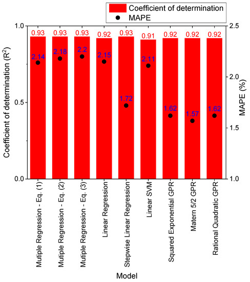 Figure 3 summarizes the MAPE and R2 of models with R2 exceeding 0.90 among the prediction models developed through the Regression Learner App and Equations (1)–(3) through multiple regression analysis. Among the models shown in Figure 3, the ideal models are the model developed using Equation (3) with the highest R2, stepwise linear regression with the lowest MAPE and highest R2, and Matern 5/2 GPR with the lowest MAPE selected from the GPR models.