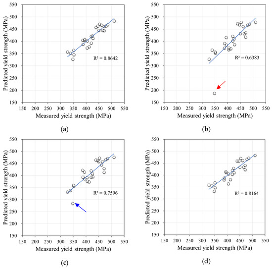 According to Figure 4, the highest R2 for the correlation between the measured and predicted yield strengths was 0.8642 in Equation (3), and a prediction model was developed using a multiple regression analysis. In contrast, the stepwise linear regression model was confirmed to have the lowest R2 at 0.6383; however, the model had an R2 of 0.7537, except for one outlier with a measured yield strength of 348 MPa, as shown in Figure 4. The linear SVM model, which had lower accuracy than stepwise linear regression and Matern 5/2 GPR in the process of prediction model development, indicated high prediction accuracy in model validation. Table 7 summarizes the MAPE and R2 to ensure the accuracy of the model during validation.