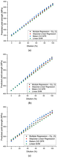 For the Matern 5/2 GPR model, the predicted yield strength increased linearly with the dilution rate up to a certain point. However, in certain dilution ranges (40–80%), the increase became nonlinear, leading to a relatively high deviation compared to the multiple regression model.
