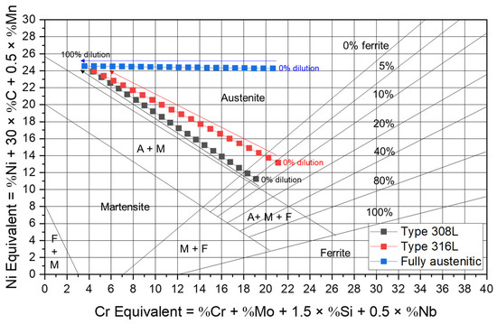 Cr and Ni equivalents according to chemical composition variation-induced dilution in Schaeffler diagram for austenitic stainless-steel-based welding consumables.