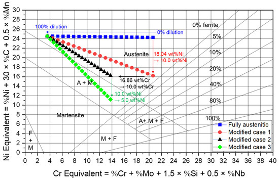 Cr and Ni equivalents according to chemical composition variation-induced dilution in Schaeffler diagram for fully austenitic welding consumable and modified welding consumables.