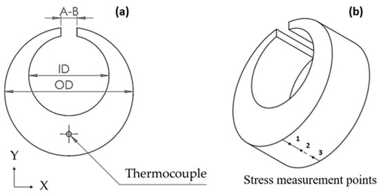 (a) Navy C-rings geometry, thermocouple position, and measurement zones of change dimensional, GAP (AB), inner diameter (ID), outer diameter (OD), (b) measurements points of the residual stresses.