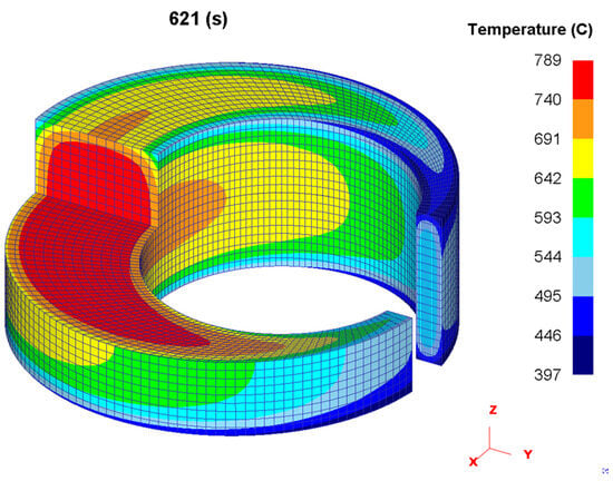 In recent years, many investigations have been carried out on the phenomena of distortion and residual stress in metallic components, mainly in processes that require high-dimensional precision, such as welding, machining, and quenching heat treatment, using finite element methods (FEM). The results obtained have contributed significantly to reducing productivity losses in manufacturing industries and increasing production processes [,,,,,,]. Cho et al. [] employed FEM to evaluate the effect of quenching heat treatment on distortion for bevel gears in machined and forged SAE 4118H steel. They used a three-dimensional scanner to determine the distortion and DEFORM® software was used to compare the simulation results with the experimental results. Slováček [] developed computational simulation that contemplates the thermal and mechanical metallurgical analysis of the quenching heat treatment using air, water, and oil as the cooling medium in components such as shafts and plates used in ships. Using SYSWELD® software, they compared the magnitude of residual stresses and hardness under different quenching environments. They showed that the finite element simulation successfully predicted the maximum magnitude of residual stresses, hardness and yield strength when cooled in water.
