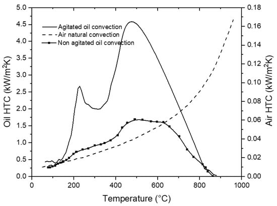 The simulation variants to reproduce the experimental quenching conditions were two different quenching media temperature (27 and 60 °C), and two different HTC as follow: the 100 L/min oil flux case was calculated by the inverse method using the experimental cooling curves, the details of which will be addressed in an unpublished work in progress by the authors. The second case for nonagitated oil convection HTC was retrieved from the bibliography (Sedighi and McMahon []). Prior to the oil contact, 20 s of natural convection in air [] were simulated to reproduce experimental quenching delay, which is the transportation and immerse time. All HTCs used in simulations can be found in Figure 3.