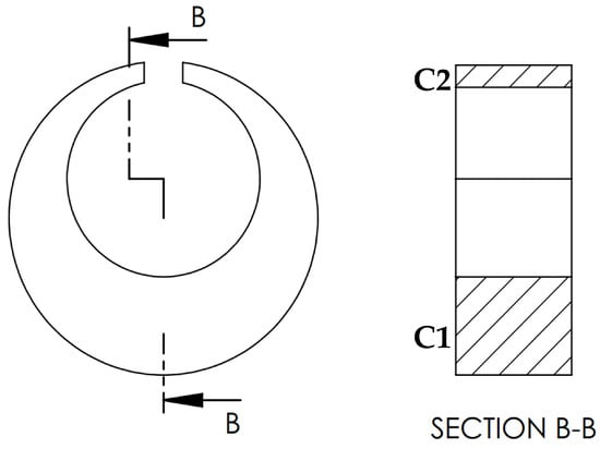 To evaluate the distortion, the measurements of the dimensions of the Navy C-rings before and after the quenching heat treatment were carried out using Mitutoyo Absolut Digimatic 500-197-30 equipment with a 0.01 mm resolution. The dimensional changes in the A-B distance (GAP), inner diameter (ID), and outer diameter (OD) for each sample were analyzed, according to Figure 1a. Measurement of residual stresses (RS) after quenching was carried out by means of the X-ray diffraction method using a STRESSTECH G2R-E unit. To evaluate the distribution of residual stresses, they were measured at 3 measurement points with 1.5 mm between each point as shown in Figure 1b.