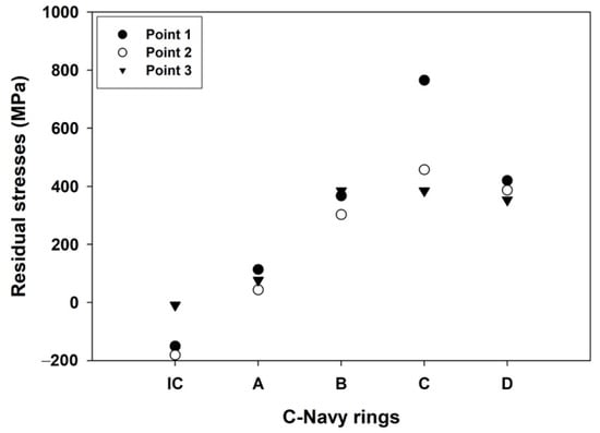 Magnitude of the residual stresses in the Navy C-rings samples (A–D) plus the initial condition (IC).