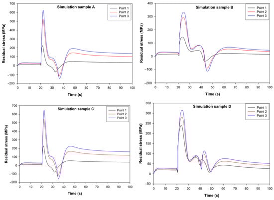 It can be observed in Figure 6 that the initial values for the C-rings without heat treatment are in a range of −10 MPa to −190 MPa, after the quenching process, and under a different set of quenching variables, the magnitude of the residual stresses changed to positive values in all cases. The lowest magnitude of residual stresses was obtained in samples A and B with 78 MPa and 351 MPa, respectively, which represent the cooling conditions with agitation at 60 °C and without agitation at 60 °C, respectively. In contrast, the highest values of residual stresses were presented in samples C and D with average values of 535 MPa and 386 MPa, respectively, which correspond to the cooling condition with agitation at 27 °C and without agitation at 27 °C of the quenching oil, respectively. It can be observed that the effect of the temperature of the oil in the liquid bath plays a more important role than the agitation of the oil in the formation of a high level of residual stress in the C-rings; in fact, a residual stress measurement in sample C is close to the yield stress of the material (≈700 MPa). In this sense, sample A presented a lower level of residual stress in the studied areas, which corresponds to a good agitation of oil at 100 L/min and a temperature of 60 °C. On the other hand, the residual stresses predicted by the FEM model (Figure 7) show greater agreement with the case of sample A, and it underestimates the stress values obtained at the end of the modeled quenching process in all the other cases (after 100 s of simulation). This may be related to the use of an experimentally calculated HTC, which contains the effect of many other factors that are not considered by a simpler model, such as the shape of the pieces, the size of the tank and its fluid dynamics effects, and the viscosity of the oil that were correctly contemplated in the calculation of the mentioned experimental HTC using real cooling curves.