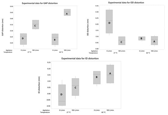 The distortion of the Navy C-rings was measured as the dimensional change in the GAP, OD, and ID after the quenching heat treatment; four repetitions were evaluated per quenching condition, and the results are summarized through its box plots in Figure 8. The ANOM test is shown in Figure 9.