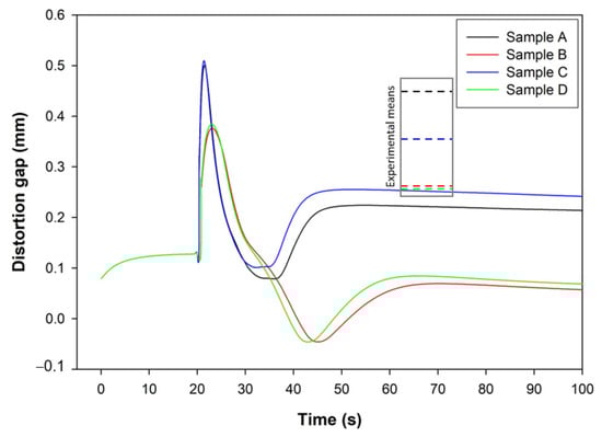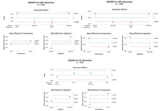 Because the C-ring samples were specially designed to induce distortion in the GAP, it can be inferred from Figure 8 that the GAP distortion is the one with less dispersion in the measurements. Also, in the ANOM test for all distortions (see Figure 9), the following is observed: The ID distortion does not show interaction between the factors and the temperature is the dominant factor on the measured response, while agitation does not show significant effects. In other words, this effect would be mainly related to thermal contraction rather than quenching conditions. Meanwhile, OD distortion seems to have a combined consequence of temperature and agitation as well as the GAP distortion but with a stronger relationship with agitation as shown by the main effects of agitation. Although the ANOM test is easy to implement and interpret, the use of more complete statistical tools such as the ANOVA test is recommended when a large amount of experimental data are available, such as in industrial applications as a powerful process control tool.