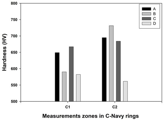 The hardness in C-rings is directly related to the volume fraction of martensitic transformation, as well as the chemical composition of the material. It can be seen that, except for sample D, the highest hardness values correspond to the section marked as C2 (see Figure 10 and Figure 11), which is related to a higher area/volume ratio at the edges (C2 zone) with respect to the volume of the whole piece, so the heat extraction is higher, and the martensitic transformation occurs first in a shorter time. According to the experimental data, sample B C2 zone presented the highest hardness 730 HV (61.5 HRC), which corresponds to the variables of oil without agitation and a temperature of 60 °C. Before the quenching heat treatment, the SAE 4340 steel samples had an average hardness of 265 HV (25 HRC); however, as expected after quenching, the hardness increased in a range between 561 HV to 730 HV (53 HRC at 61.5 HRC), which agrees with the type of steel and the microstructure found in Figure 5.