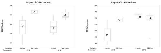 The hardness in C-rings is presented in Figure 10; for C1 and C2, respectively, average values taken from the core of each zone were reported to evaluate the effect of thickness. The experimental data are presented in box charts and ANOM test in Figure 11 and Figure 12, respectively.