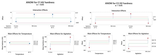 The ANOM test for the C1 zone in Figure 12 shows that the agitation has a dominant effect over the hardness of the samples and no interaction with the temperature factor. The variations oscillate between 585 HV and 660 HV (see Figure 10 and Figure 11) and show that when there is a good agitation in the liquid bath, the hardness increases, because the more the agitation, the more effective the heat transfer. On the other hand, the temperature of the oil did not show a significant effect on the hardness, generating an average magnitude of 620 HV. In contrast, for the C2 zone, the result is that the oil temperature has the greatest effect on hardness, which is greater when the oil temperature is 60 °C, when hardness levels reach above 710 HV. However, the agitation of the liquid did not show such a severe effect but interacted strongly with the temperature in this zone.